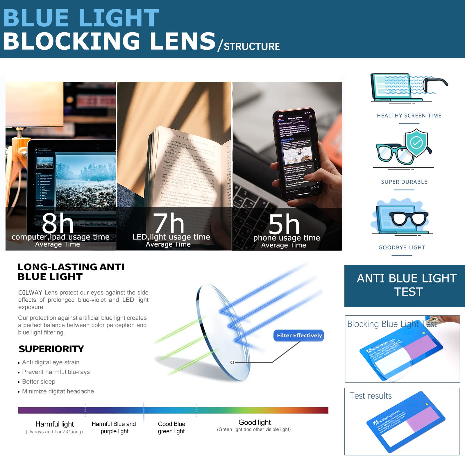 Reduce Headaches Do you have a headache from using the screen for a long time? Excessive exposure to digital screens can cause digital headaches, Oilway blue light blocking glasses enhance your health by blocking harmful blue light while letting in all other beneficial light.” “Sleep Tight Exposure to high-speed blue light can suppress the secretion of melatonin, an important hormone that affects sleep, leading to poor sleep quality. Wearing Oilway blue light filtering glasses can improve sleep and help you sleep better and get a good night’s sleep.” “Anti-Eye Fatigue Prolonged exposure to blue light can cause eyestrain/eyestrain, and long-term eye strain may lead to increased myopia symptoms and diplopia. Wear Oilway blue light glasses and your eyes will no longer be tired. Reduce eye strain and light sensitivity when facing digital screens. Perfect for office workers or anyone who needs to watch a screen all day.” “One Piece Nose Pads Make the glasses fit the face and share the pressure on the bridge of the nose, suitable for various nose shapes. The frame will not slip off easily, making it more stable and comfortable to wear.” “Elastic Spring Hinge Hidden spring hinge, very flexible and elastic, it will not pinch the face and press the nose, and it is durable.” “Lightweight Framework 30% lighter than ordinary glasses, Oilway glasses are as light as a feather, giving you a long-lasting and comfortable wearing experience.